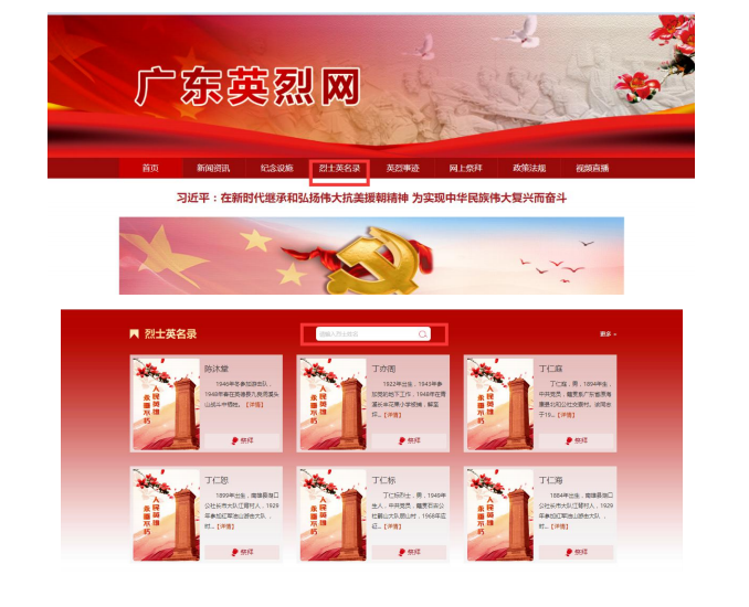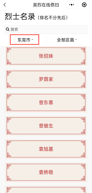 进入“英烈在线祭扫”后,选择所属地域或全部地域,可见烈士名录,也可以搜索烈士英名查询。