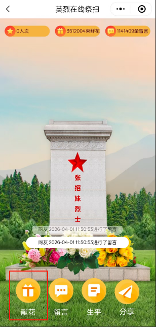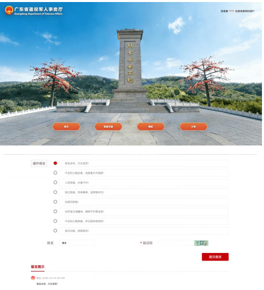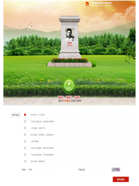 祭扫全体南粤英烈。点击首页“欢迎您为烈士献花”飘窗或点击“网上祭拜”,点击“敬献花篮”进入祭扫页面,可向全体南粤烈士“献花”、“祭拜”、“留言”。