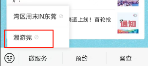 第二步:点击左下方自定义菜单中“微服务”,选择“潮游莞”,即可进入“潮游莞”小程序首页。